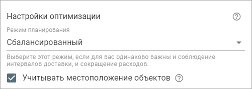 | Сбалансированный | Максимальная загрузка транспорта, минимальный пробег, без нарушений интервалов доставки. |
