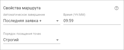 | В указанное время | Маршрут завершается в указанное время (поле Время). Если последняя заявка выполняется позже этого времени, то маршрут завершается в то же время на следующие сутки. |