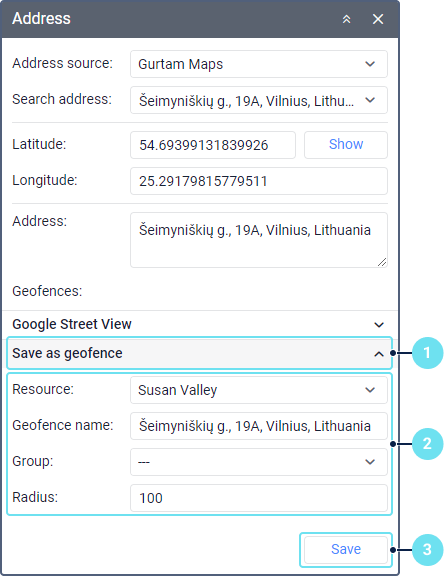 This tool is designed to search for places on the map and determine the address of points. It also allows you to save the marked place as a geofence.