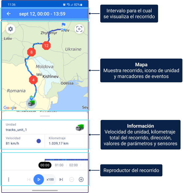 - Mapa: Muestra el recorrido, el ícono de la unidad, los marcadores de inicio y fin de recorrido, y los marcadores de evento.
