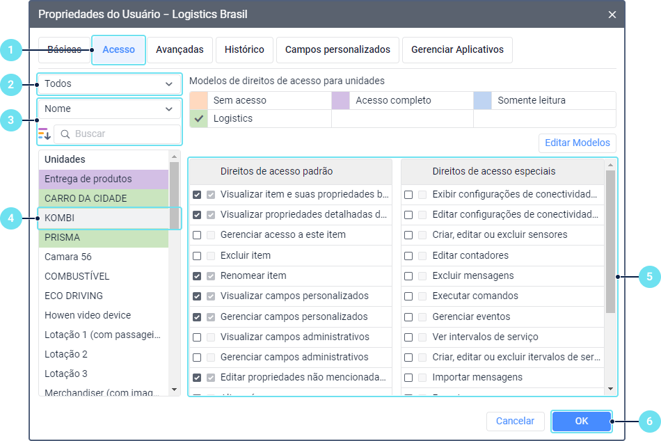 Selecione o tipo de objeto ao qual o usuário deve ter acesso: unidades, grupos de unidades, usuários, recursos ou rotas.