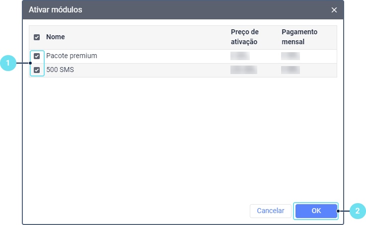 O usuário principal pode ativar módulos adicionais, como 50 unidades extras, 500 mensagens e outros. Para isso, abra a janela Ativar módulos selecionando o item de mesmo nome no menu do usuário.