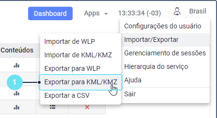 - No menu do usuário, selecione o item Importar/Exportar e clique em Exportar para KML/KMZ.