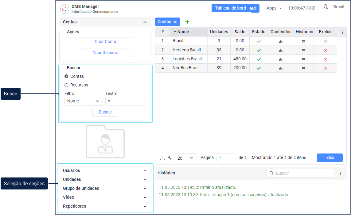 | Ações | Nesta seção é possível visualizar um botão para criar objetos do sistema (contas, usuários, unidades, etc.). Para a seção Usuários, o botão Quadro de aviso também está disponível. |