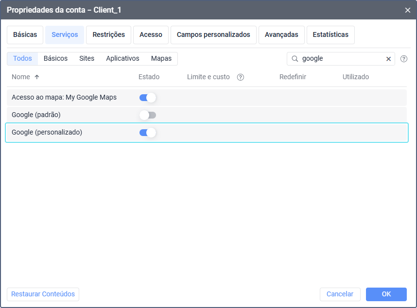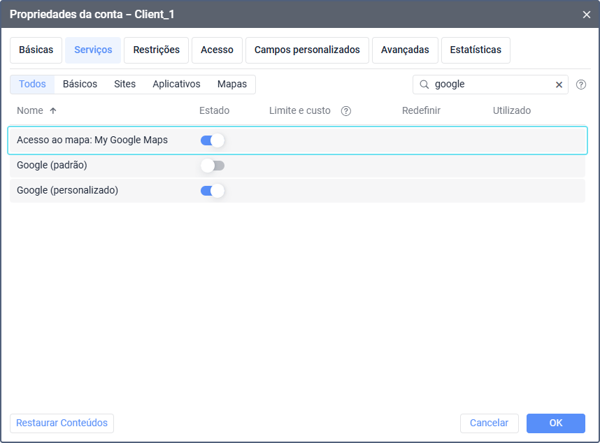 Para os mapas do Google, ative adicionalmente o Google (personalizado) ou o Google (padrão). Para outros mapas, ative os serviços com o nome de uma fonte de mapa e a marca “custom” entre colchetes, por exemplo, Bing (custom).