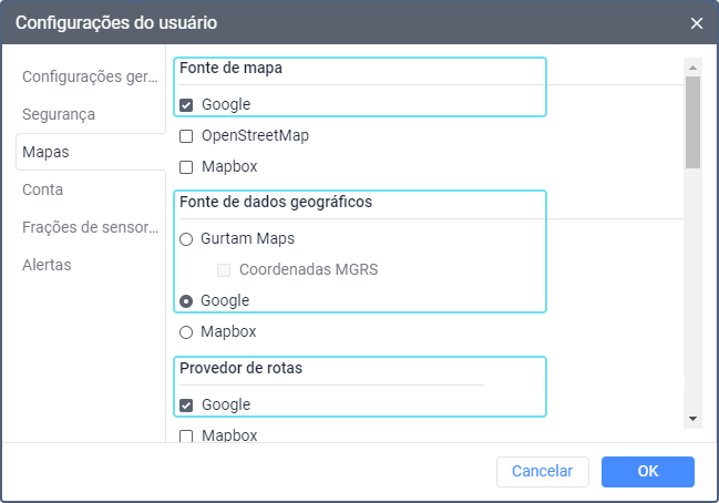 Nas configurações de usuário do sistema de monitoramento, selecione o mapa adicionado. Dependendo dos tipos de serviços selecionados na etapa 6, ele poderá estar disponível em Fonte de mapa, Fonte de dados geográficos, Provedor de rotas.