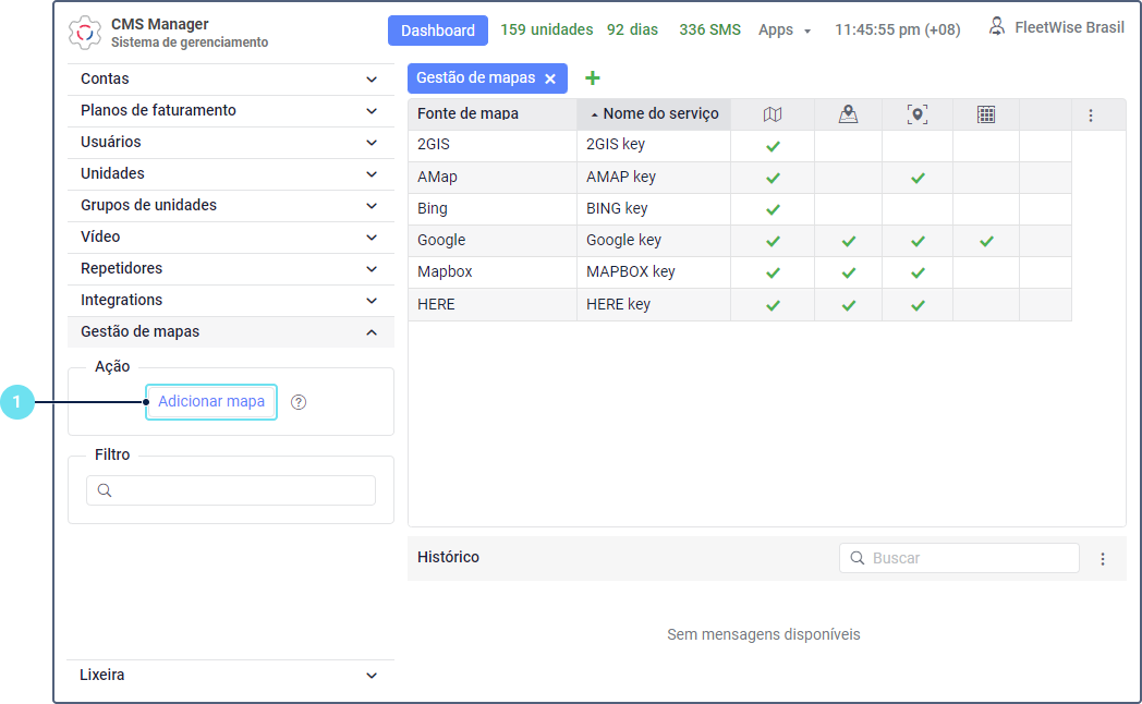 A seção Gestão de mapas está disponível apenas no CMS Manager e somente para contas principais. Nesta seção é possível adicionar, editar e excluir mapas. Uma tabela padrão exibe todos os mapas que podem ser usados como mapa base, fonte de roteamento, fonte de geodados e matriz de distância. Os serviços disponíveis de cada mapa são marcados com o ícone