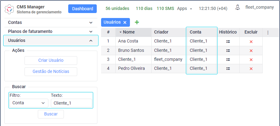 Certifique-se de que nenhum usuário esteja associado à conta principal, caso contrário todos os serviços serão habilitados para eles automaticamente. Para isso, selecione o filtro Conta na aba Usuários e insira o nome da conta principal.