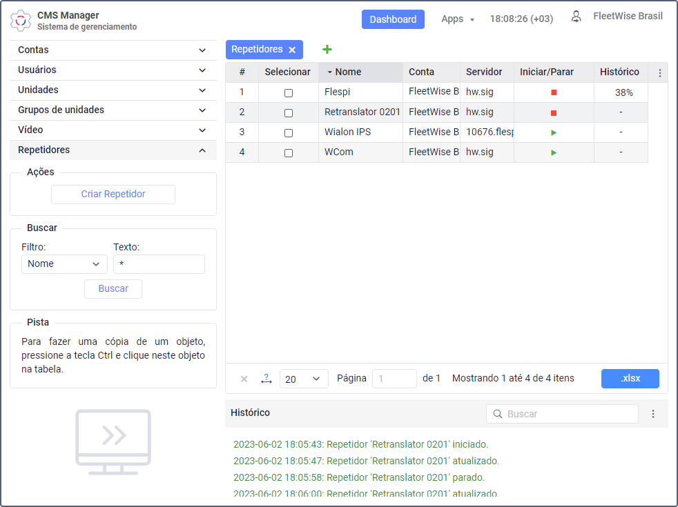 Só é possível trabalhar com repetidores na seção Repetidores do sistema de gerenciamento. Lá é possível realizar as seguintes ações com eles: