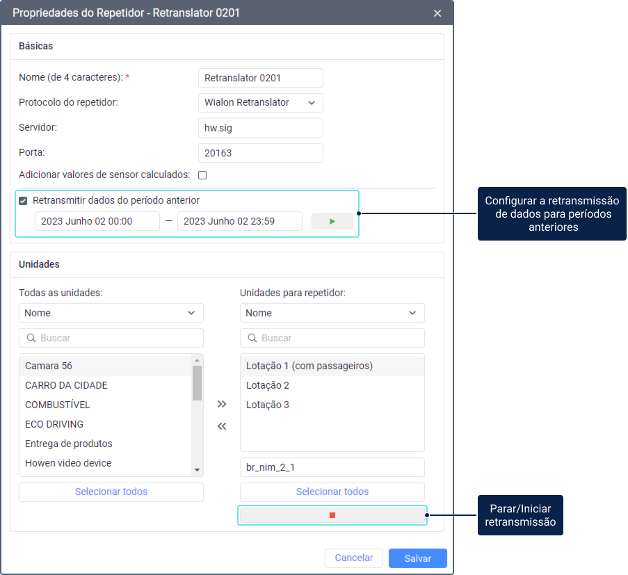 As mensagens das unidades são transmitidas apenas quando o repetidor é iniciado. Por padrão, os dados são transmitidos em tempo real. Se a transmissão for suspensa, as mensagens acumuladas durante esse período não serão transmitidas. Para transmiti-las, use a opção Retransmitir dados do período anterior.