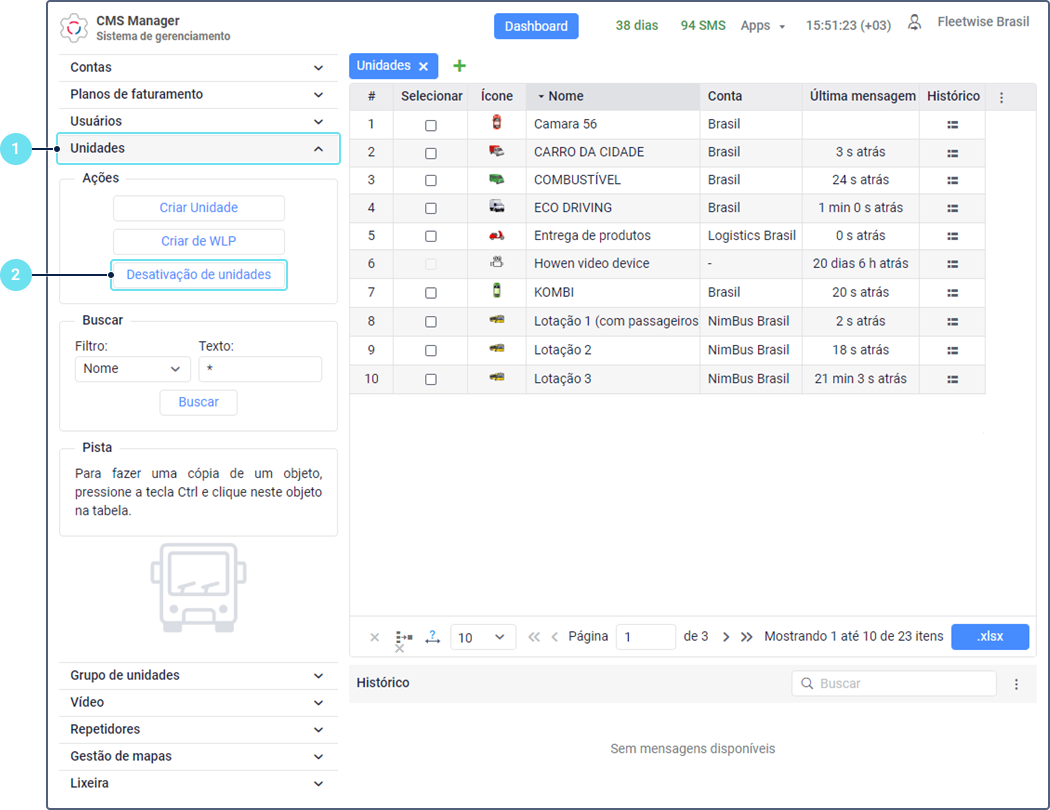 Enquanto uma unidade está desativada, o sistema não aceita novos dados (mensagens) dela. No entanto, seus dados recebidos antes da desativação são armazenados durante o período de histórico definido para a conta.