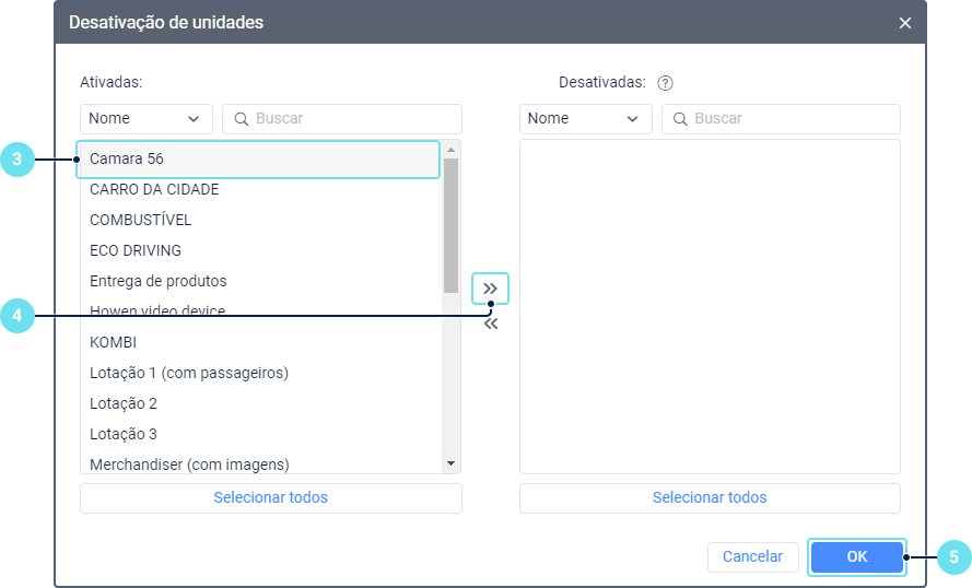 Para ativar uma unidade, siga os passos 1–5 da desativação, porém no passo 3, selecione a unidade na lista da direita e mova-a para a esquerda usando o ícone