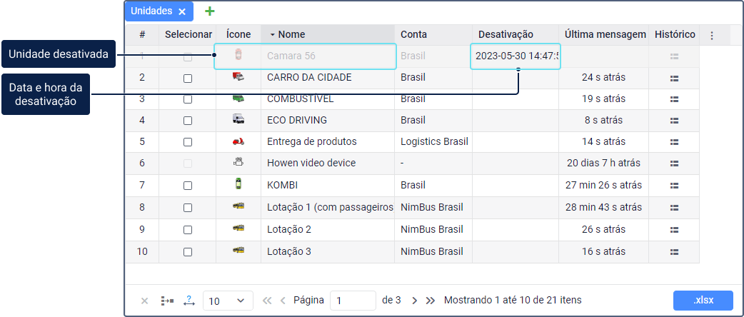 As linhas com unidades desativadas são destacadas em cinza claro na tabela. A data e hora da desativação são exibidas na coluna Desativação.