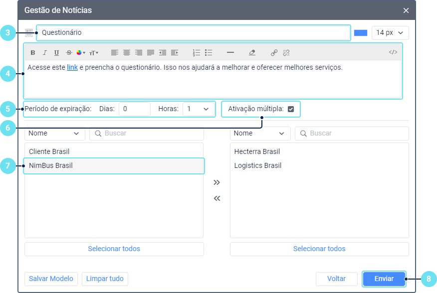 Na janela Gestão de notícias é possível criar mensagens informativas (avisos) e enviá-las aos utilizadores.