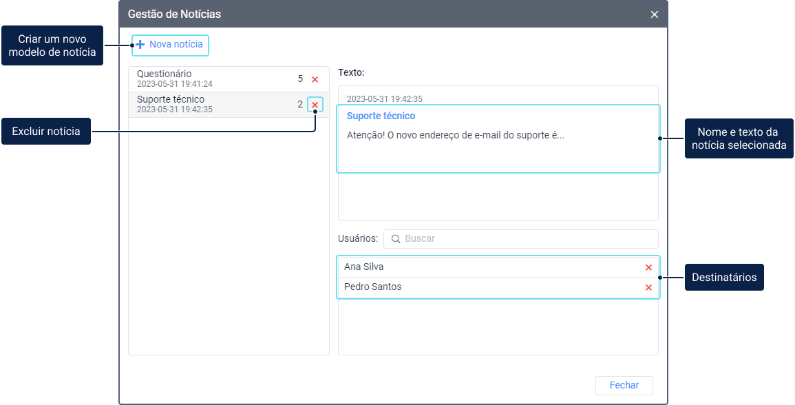 Para ver o texto da notícia, clique na linha dela na lista. Abaixo do campo com o texto será possível ver a lista de todos os usuários especificados como destinatários da notícia. Para buscá-las rapidamente, utilize o filtro dinâmico.