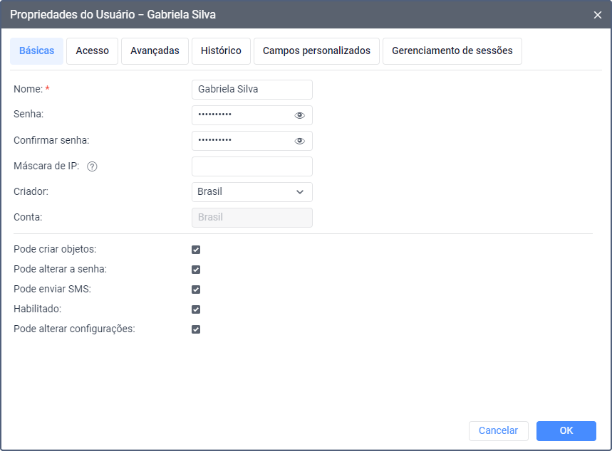 Nesta aba é possível especificar as propriedades básicas do usuário e selecionar quais ações devem estar disponíveis para esse usuário.