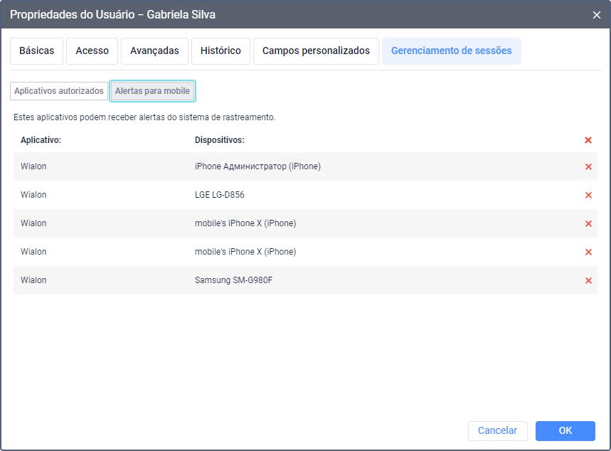 Para evitar que o aplicativo envie alertas móveis, remova-o da lista clicando no ícone