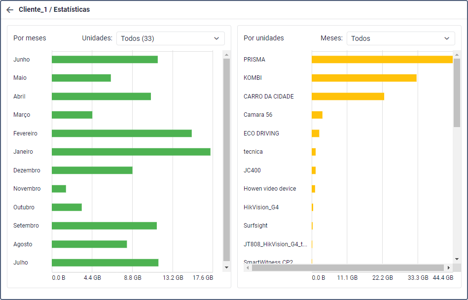 É possível ver estatísticas sobre o uso dos dados móveis para cada conta. Para isso, clique em Estatísticas acima da tabela de unidades. A janela exibe dois gráficos: por mês e por unidade.