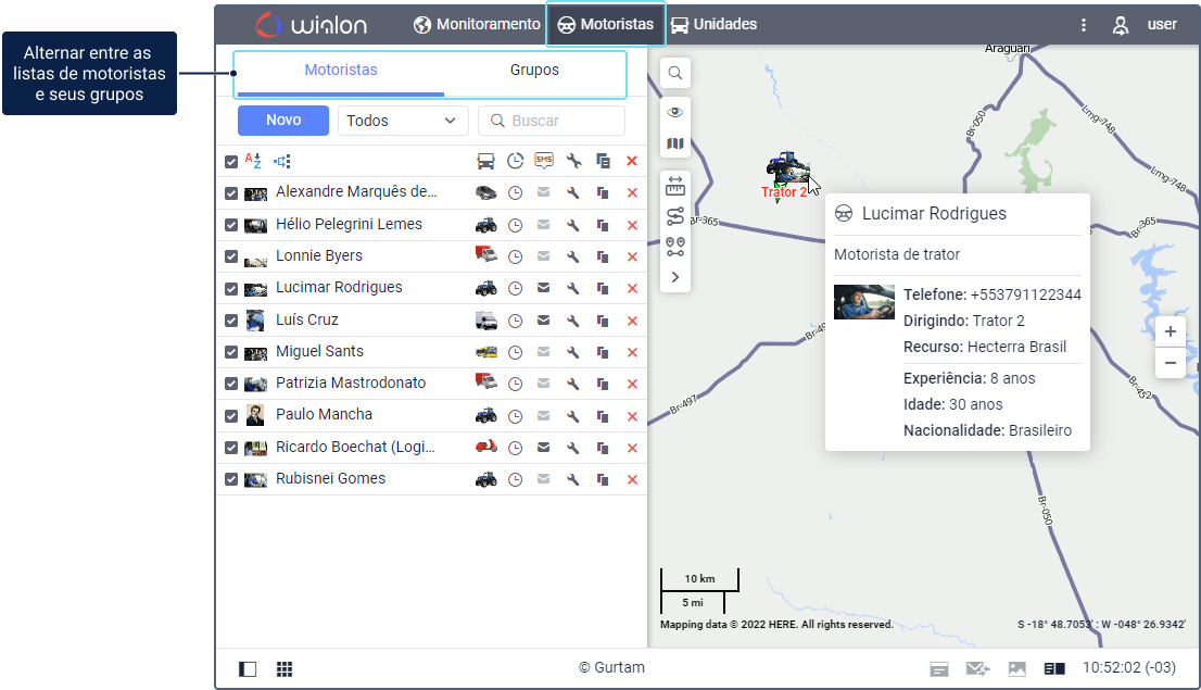 Para trabalhar com motoristas clique na aba Motoristas no painel superior ou selecione o item com o mesmo nome no menu principal. Para trabalhar com grupos de motoristas, alterne para o modo Grupos.
