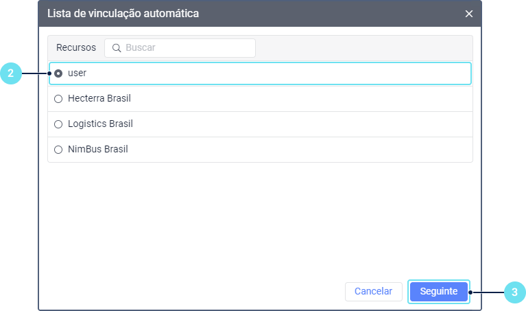 - Selecione o recurso para cujos motoristas deseja configurar a vinculação automática. Para descobrir quais motoristas pertencem a um determinado recurso, aplique a filtragem por recurso à lista de motoristas (exibida à direita do botão Novo). Se apenas um recurso estiver disponível, este será selecionado automaticamente.