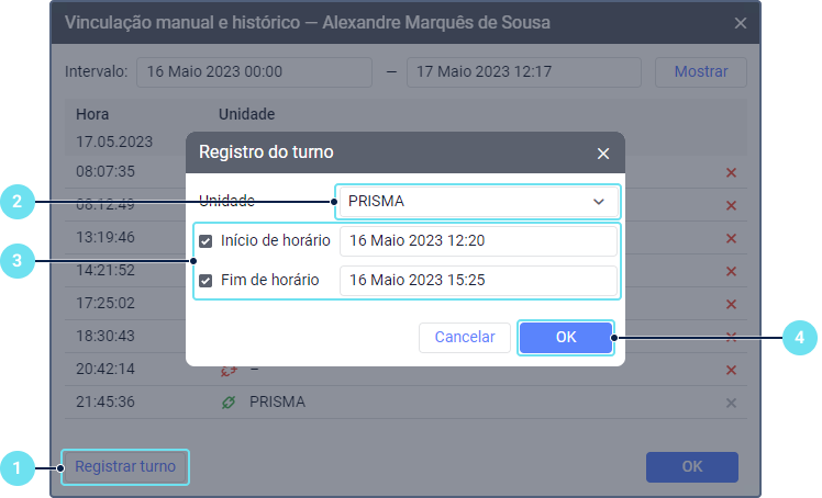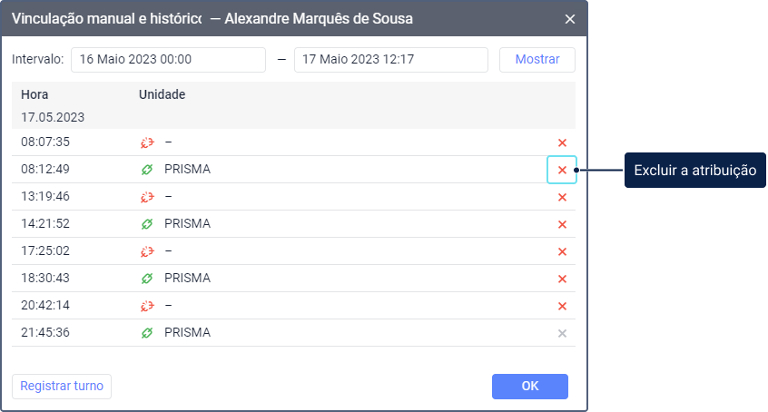 O recurso Histórico de vinculações permite visualizar o histórico de vinculações, adicionar registros de vinculações manualmente (registrar turnos de trabalho) e excluí-los, se necessário. Para realizar essas ações, clique no ícone