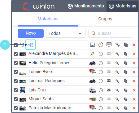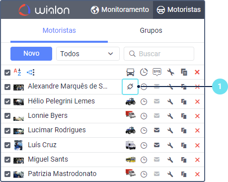ao lado do motorista desejado na lista de motoristas ou nos grupos de motoristas. Caso não tenha o direito de acesso Criar, editar ou excluir motoristas para o recurso em questão, o ícone estará inativo (