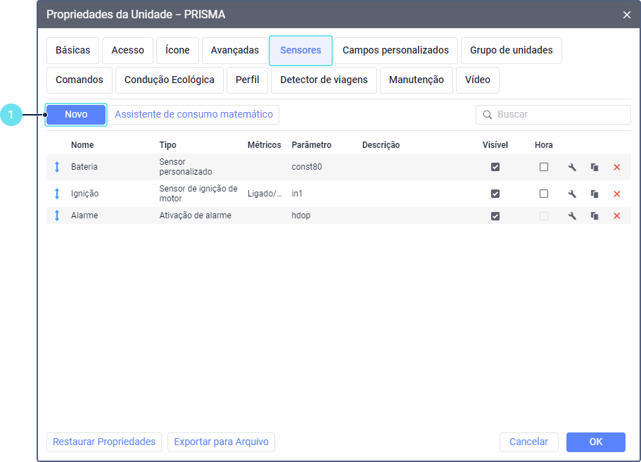 ) na aba Sensores nas propriedades da unidade desejada.