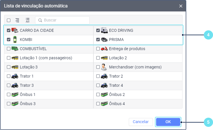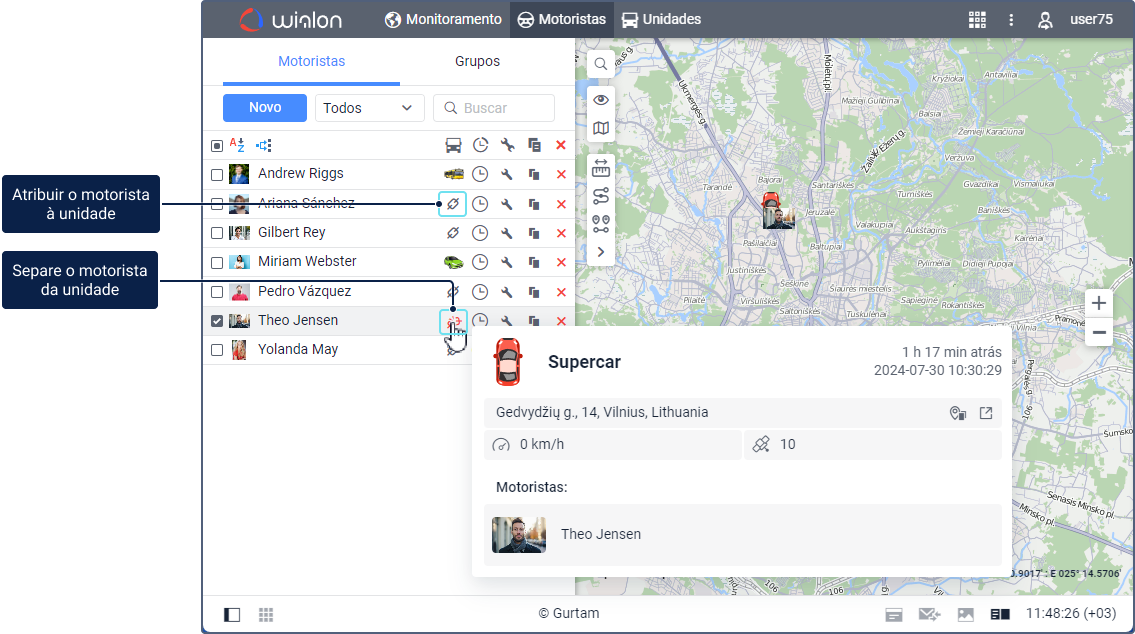 Os motoristas podem ser atribuídos às unidades manualmente ou automaticamente. Depois de atribuídos é possível trabalhar com o histórico de vinculações.