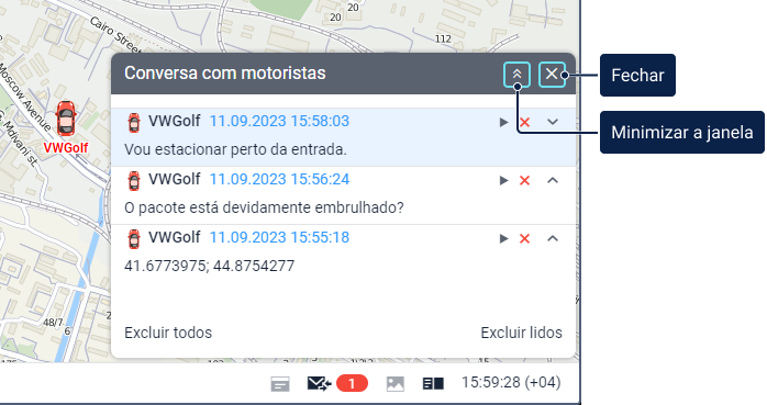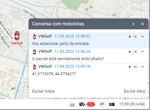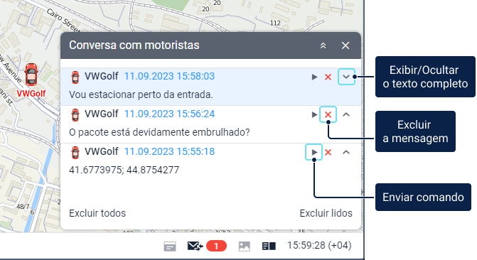 Todas as mensagens dos motoristas foram lidas. É possível abrir a janela de conversa para ver essas mensagens novamente. | |
