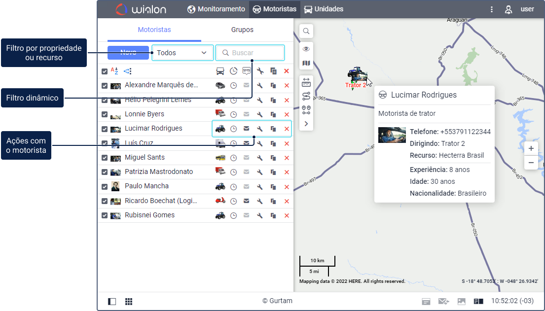 - filtro por propriedade (motoristas não atribuídos ou atribuídos) ou recurso,