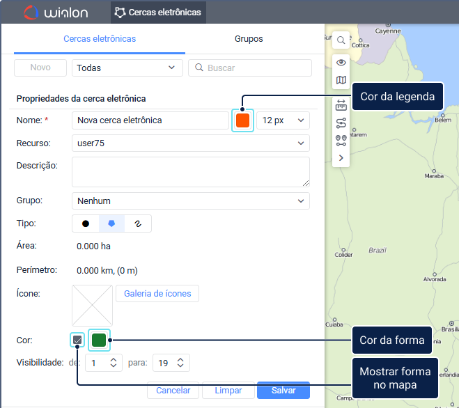 | Área | A área de cerca eletrônica que é calculada automaticamente. O valor da área depende do sistema de medidas do recurso e pode ser indicado em ha (hectares) ou mi² (milhas quadradas). |
