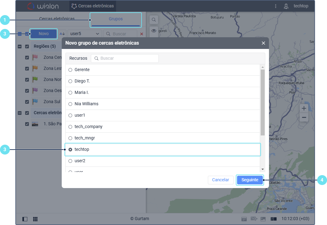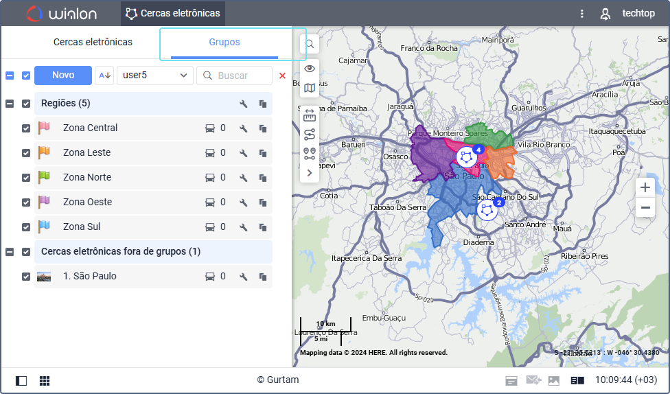 Para usar grupos de cercas eletrônicas é necessário possuir os mesmos direitos de acesso referentes ao uso de cercas eletrônicas. Os grupos de cercas eletrônicas são usados para combinar cercas eletrônicas de acordo com determinados critérios. Além disso, é possível usar grupos como filtro em alguns modelos de relatório e em alertas do tipo Cercas eletrônicas. Para abrir a lista de grupos, use o seletor na parte superior do espaço de trabalho.
