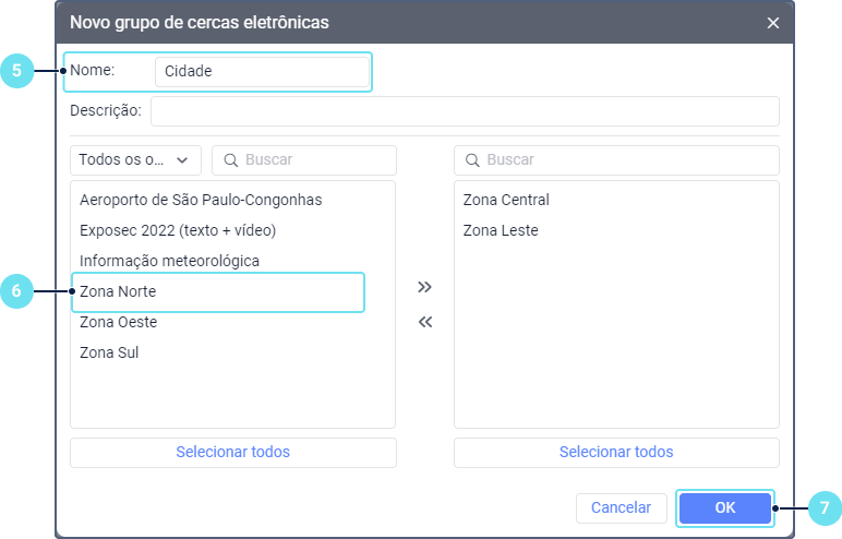 . Para selecionar todas as cercas eletrônicas de uma vez, clique em Selecionar todos. Para selecionar todas ou várias cercas eletrônicas de uma vez também é possível utilizar atalhos especiais. Para adicionar uma cerca eletrônica ao grupo, basta clicar duas vezes no nome dela. -