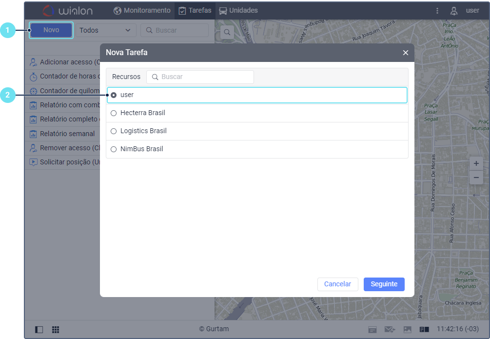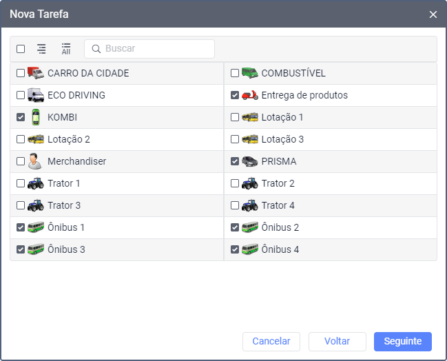 A janela de seleção de unidades exibe as unidades da lista de tarefa na aba Monitoramento. Se a janela não exibir nenhuma unidade, clique no botão