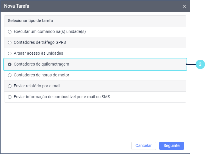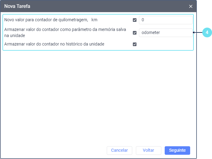 Defina os parâmetros que dependem do tipo de tarefa selecionada e estão descritos na seção Tipos de tarefa. No caso da tarefa Enviar comando para unidades, esta etapa acontece após a seleção da unidade.
