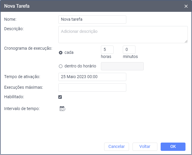 Habilitado | O estado da tarefa. Se esta opção estiver ativada, a tarefa será habilitada após sua criação, caso não esteja, ela será desabilitada. É possível habilitar a tarefa desabilitada na lista de tarefas. |