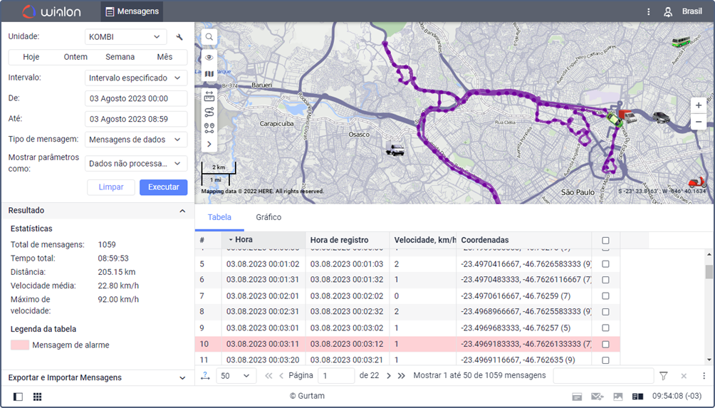 Na aba Mensagens é possível visualizar todas as mensagens recebidas das unidades (coordenadas, parâmetros, velocidade, etc.), bem como mensagens SMS, comandos enviados às unidades e eventos registados no histórico das unidades. Além disso, esses dados podem ser exportados para vários formatos.