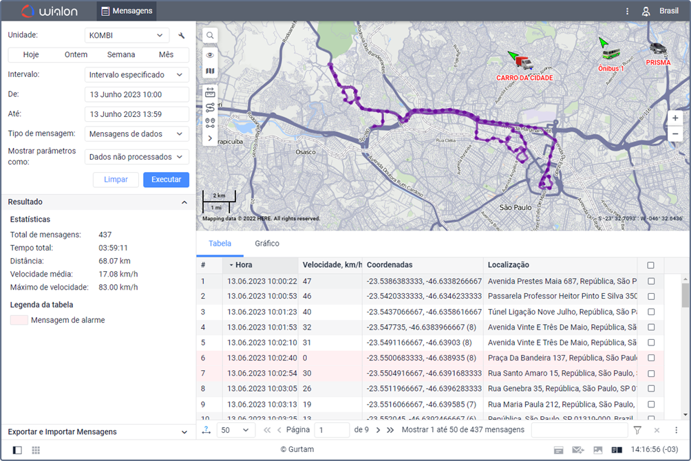 Depois de consultar as mensagens, o percurso da unidade é exibido no mapa.