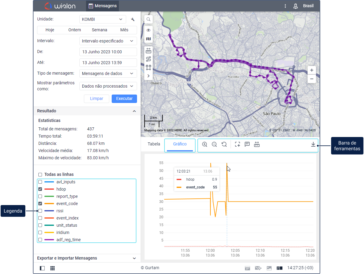 Ao abrir outras abas, o layout do mapa e as linhas do percurso são salvos. Para limpar o mapa é possível desativar a camada Mensagens ou voltar para a aba Mensagens e pressionar Limpar.