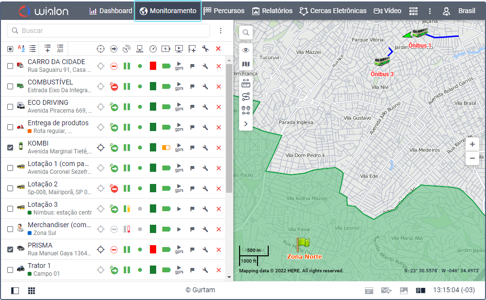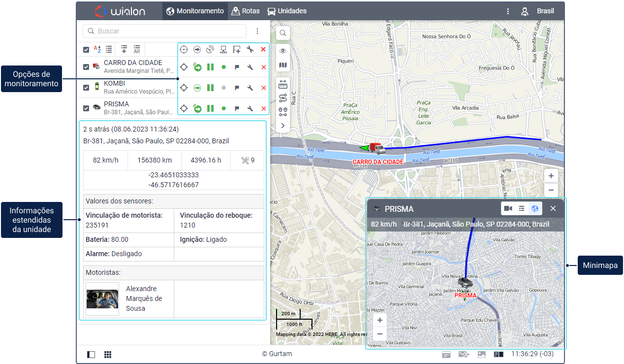 Na aba Monitoramento é exibida a lista de trabalho das unidades e o mapa onde se pode acompanhar o seu movimento em tempo real. Nela se encontram os recursos básicos relacionados ao rastremento de unidades e de seus parâmetros.