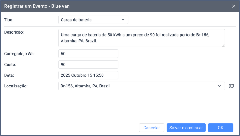 Selecione este tipo de evento para registrar uma carga de bateria para a unidade, incluindo dados sobre volume e custo. Se um sensor de carga de bateria estiver configurado para a unidade, é possível comparar os dados de volume especificados com as leituras do sensor no relatório de Abastecimentos de combustível e cargas de bateria.