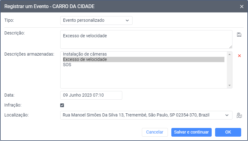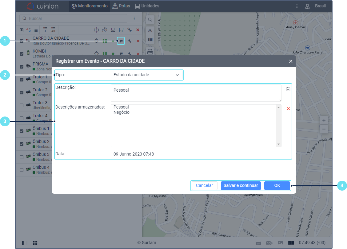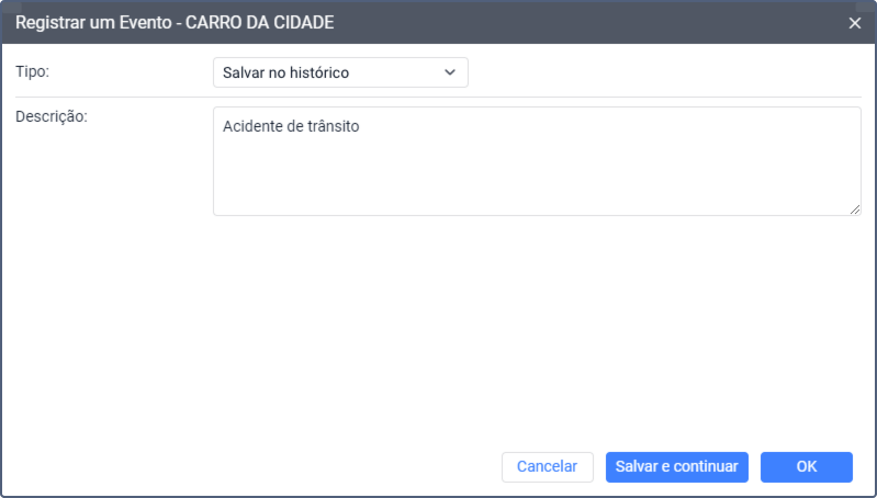A opção Registrar um evento na aba Monitoramento permite efetuar registros no histórico da unidade e registrar ocorrências da unidade para análise posterior na aba Mensagens e em relatórios. Esta opção permite registar os seguintes tipos de eventos: