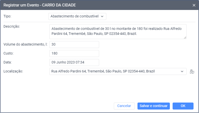 Selecione este tipo de evento para registrar um abastecimento de combustível para a unidade, incluindo dados sobre volume e custo. Se um sensor de nível de combustível estiver configurado para a unidade, é possível comparar os dados de volume especificados com as leituras do sensor no relatório de Abastecimentos de combustível e cargas de bateria.