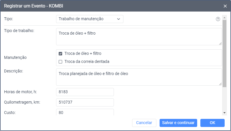 | Descrição | As informações sobre o abastecimento de combustível. Por padrão, este campo mostra um texto mo qual os valores de volume e custo do abastecimento são adicionados automaticamente ao especificar os parâmetros abaixo. Se necessário, a descrição pode ser editada. |