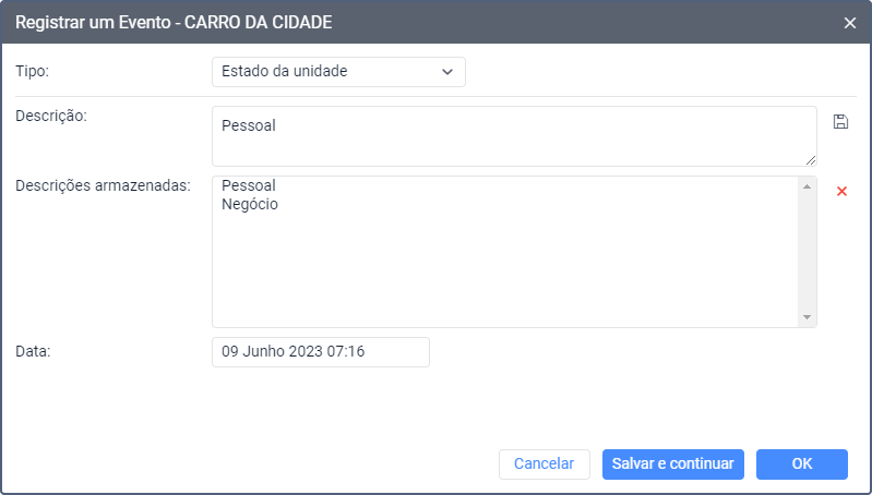 Selecione este tipo de evento para registrar qualquer status da unidade como, por exemplo, uso pessoal ou comercial do veículo.