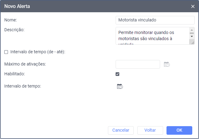 Especifique o nome do alerta e os parâmetros relacionados ao horário e a duração do acionamento. Clique em OK para salvar as alterações.