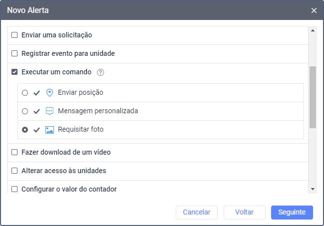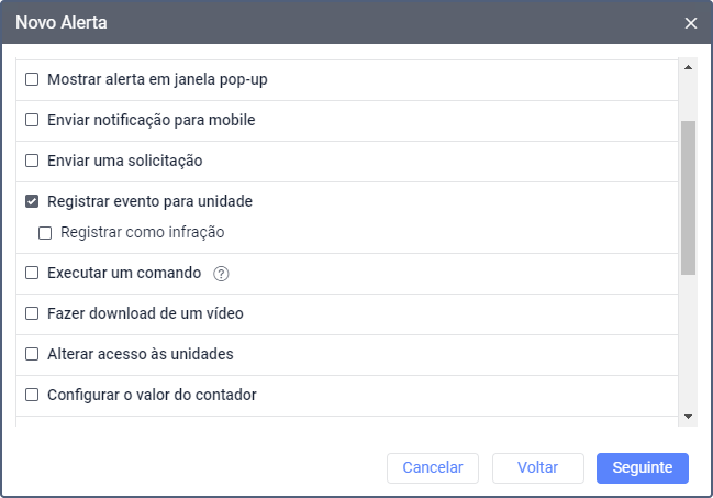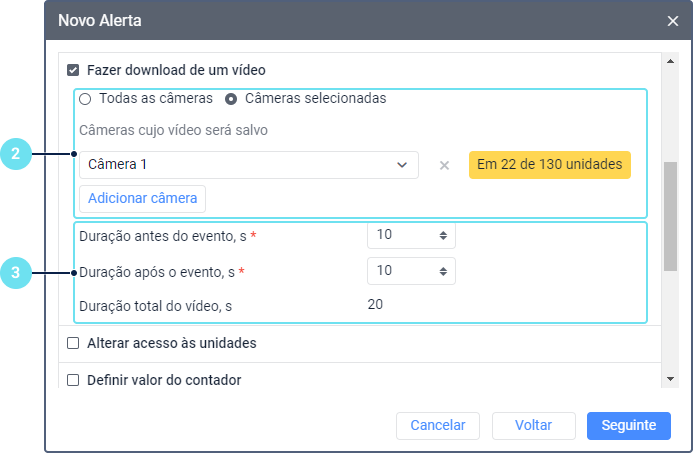 Esta ação permite que você salve automaticamente um trecho de vídeo capturado pelas câmeras da unidade no momento em que o alerta for acionado. Você pode usar esse alerta para várias unidades.