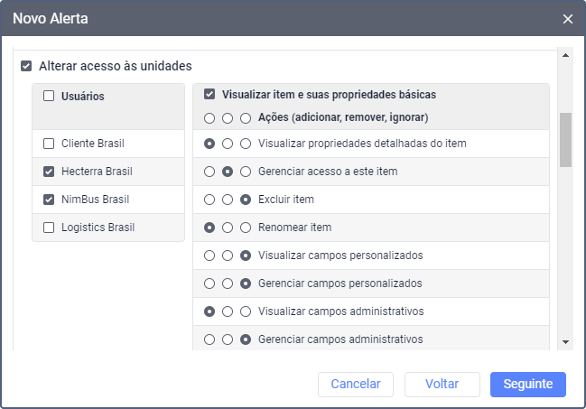 | Utilizar unidade em tarefas, alertas, rotas, repetidores | O usuário que configura o alerta e o usuário-criador do recurso ao qual o alerta pertence devem ter esse direito de acesso a todas as unidades selecionadas. | |