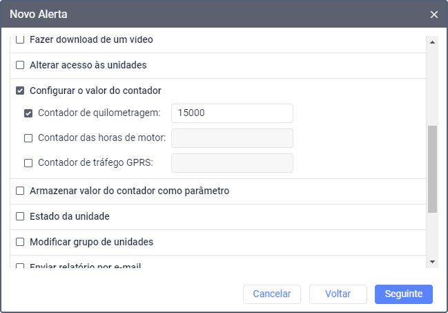 Para configurar essa ação, selecione os contadores necessários e especifique os valores que esses contadores devem mostrar quando o alerta for acionado.