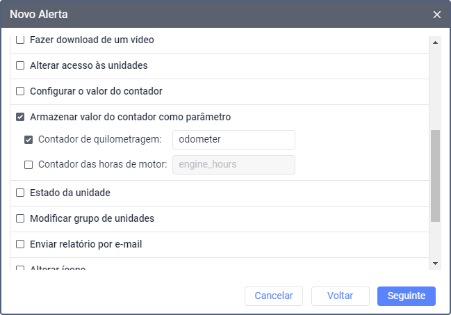 Esta ação permite salvar o valor da quilometragem atual (parâmetro odometer) ou horas do motor (parâmetro engine_hours) como um parâmetro na mensagem. Isso é necessário para mostrar os valores de quilometragem inicial e final no relatório sobre viagens e converter o parâmetro engine_hours no sensor de horas do motor para outras operações. Para isso é preciso possuir o direito de acesso Editar contadores à unidade.